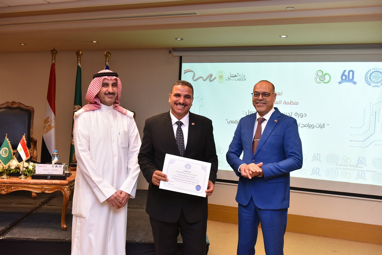 سلم وزير العمل، محمد جبران، برفقة السيد فايز المطيري، المدير العام لمنظمة العمل العربية، شهادات اجتياز الدورة التدريبية المتخصصة التي نظمتها المنظمة بالقاهرة تحت عنوان: