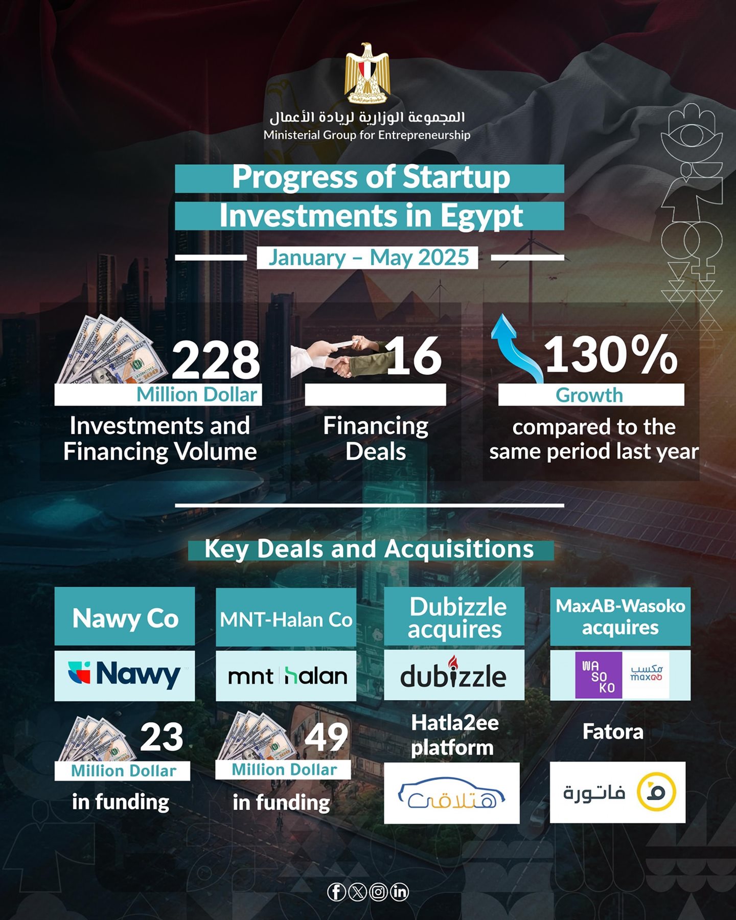 أعلنت المجموعة الوزارية لريادة الأعمال أن استثمارات الشركات الناشئة في مصر تجاوزت 228 مليون دولار خلال الخمسة أشهر الأولى من عام 2025، مسجلة نموًا ملحوظًا مقارنة بنفس الفترة من العام الماضي. وشهدت الفترة تنفيذ 16 صفقة استثمارية في مجالات رأس المال المخاطر والتمويل بالدين، منها 11 صفقة تم الإعلان عن قيمتها، بإجمالي استثمارات بلغ 156 مليون دولار، بالإضافة إلى تمويلين بالدين لشركتي «ناوي» و«MNT-حالا» بقيمة 23 مليون و49 مليون دولار على التوالي.
