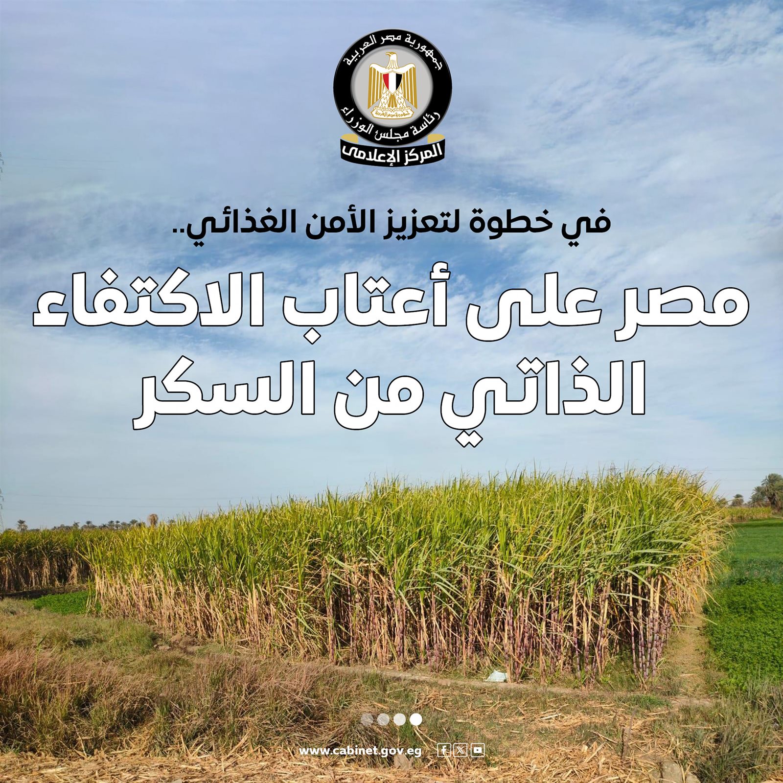 أعلن المركز الإعلامي لمجلس الوزراء أن مصر تقترب من تحقيق الاكتفاء الذاتي الكامل من السكر اعتبارًا من مطلع عام 2026، مدعومة بجهود الدولة في التوسع بزراعة المحاصيل السكرية وزيادة الإنتاج المحلي، في إطار تعزيز الأمن الغذائي وضمان استقرار الأسواق.