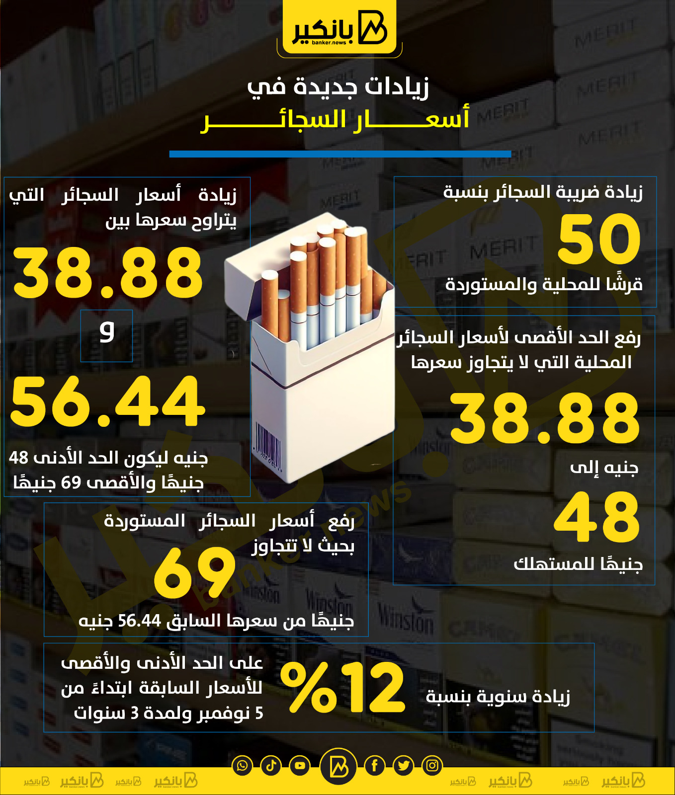 • زيادة أسعار السجائر التي يتراوح سعرها بين 38.88 جنيه و56.44 جنيه ليكون الحد الأدنى 48 جنيهًا والأقصى 69 جنيهًا
