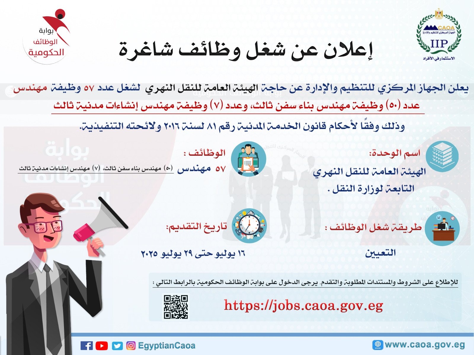 أعلن الجهاز المركزي للتنظيم والإدارة، برئاسة المهندس حاتم نبيل، عن حاجة الهيئة العامة للنقل النهري التابعة لوزارة النقل، لشغل عدد من الوظائف الهندسية الشاغرة، وذلك وفقًا لأحكام قانون الخدمة المدنية رقم 81 لسنة 2016 ولائحته التنفيذية.