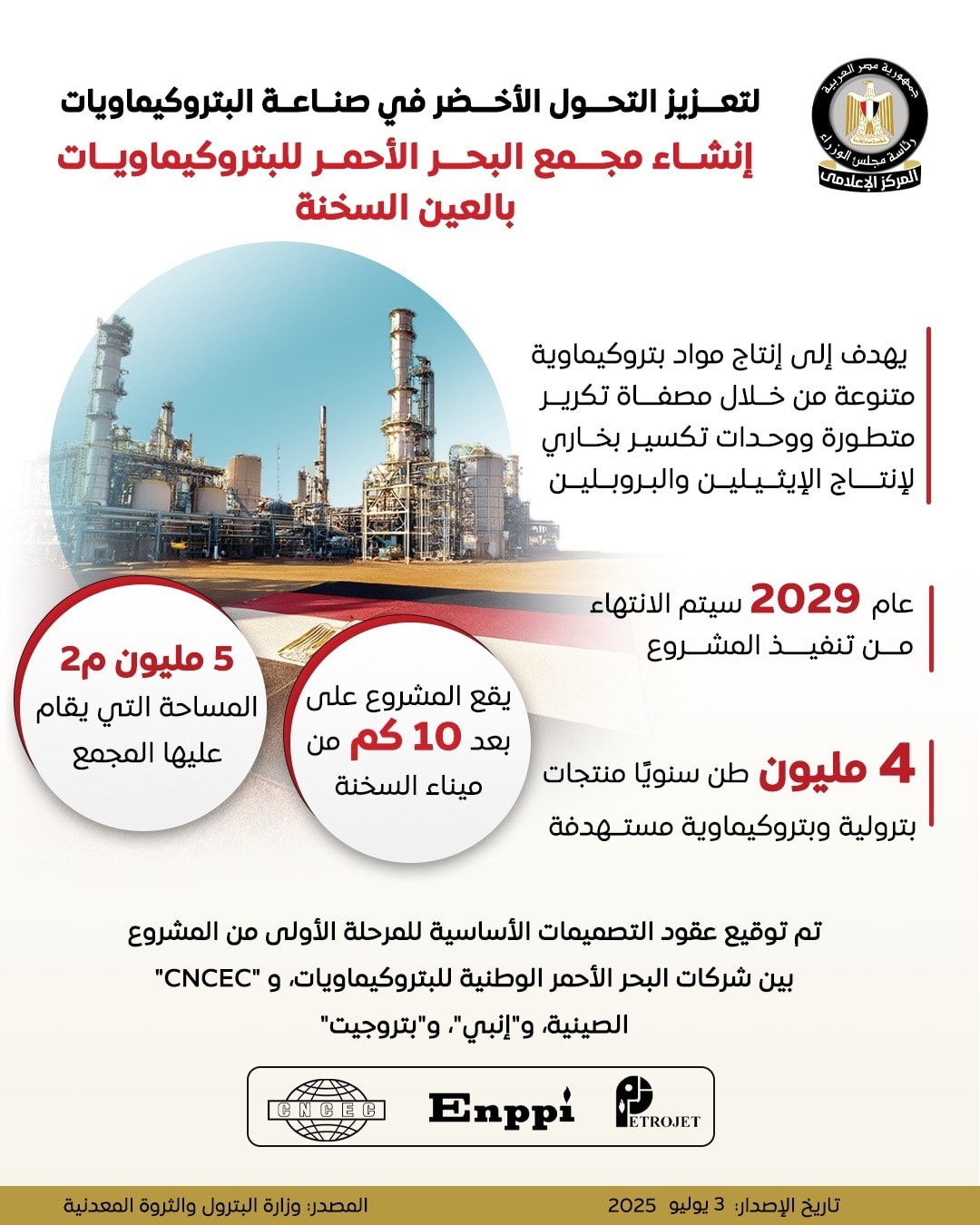 ويُقام المجمع على بعد 10 كيلومترات فقط من ميناء السخنة، ما يمنحه موقعًا لوجستيًا فريدًا يُسهل الربط بحركة التجارة الدولية وأسواق التصدير. ويهدف المشروع إلى إنتاج طيف واسع من المواد البتروكيماوية ذات القيمة المضافة العالية، عبر منظومة متكاملة تشمل مصفاة لتكرير النفط ووحدات تكسير بخاري لإنتاج الإيثيلين والبروبلين، وهما من الركائز الأساسية في الصناعات البلاستيكية والهندسية.