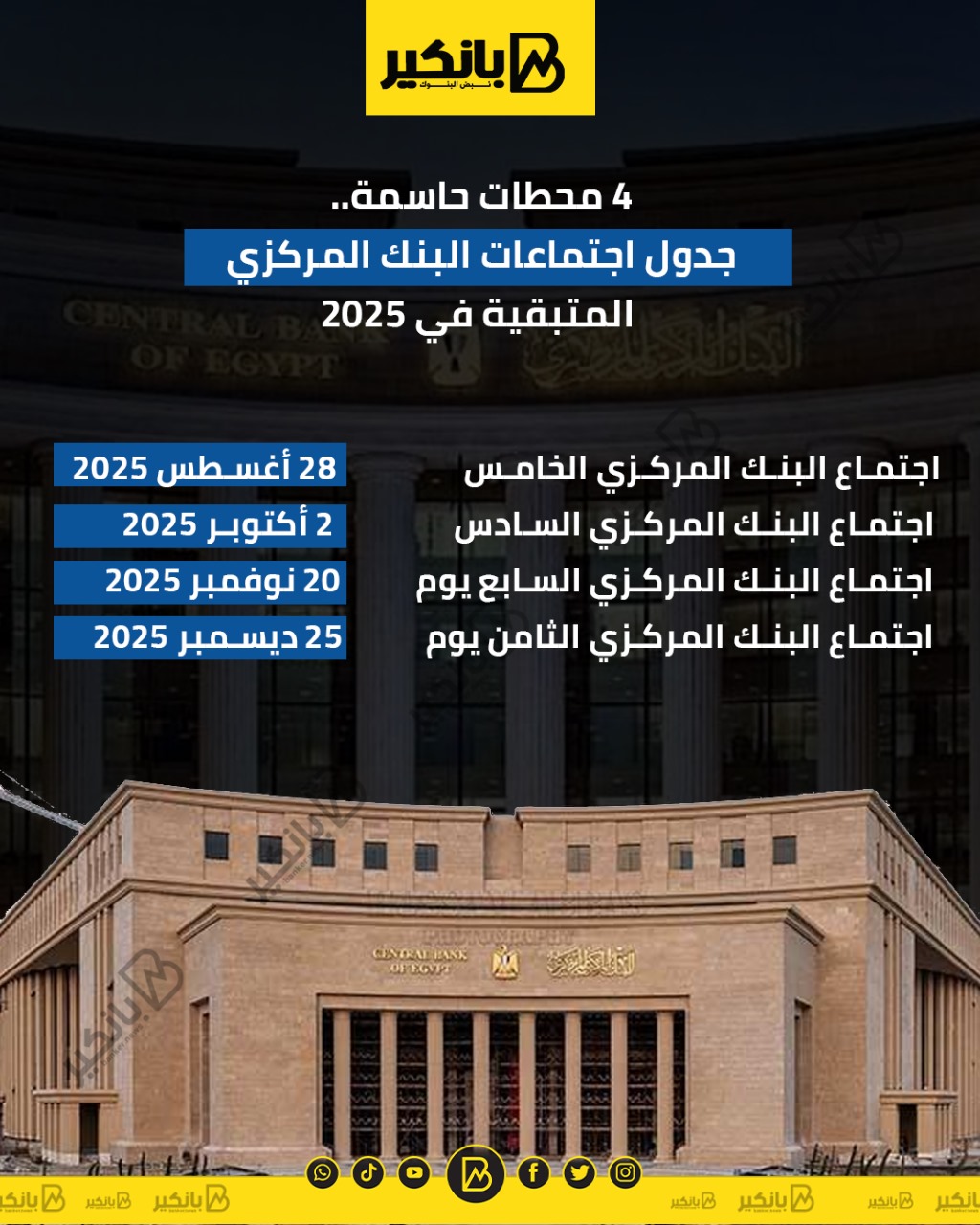 4 محطات حاسمة.. جدول اجتماعات البنك المركزي المتبقية في 2025 | إنفوجراف