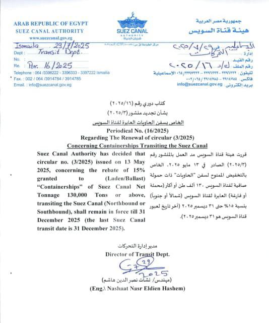وقال القرار الصادر عن الهيئة: “قررت هيئة قناة السويس مد العمل بالمنشور رقم (3/ 2025) الصادر في 3 مايو 2025 الخاص بالتخفيض الممنوح لـ سفن الحاويات ذات حمولة صافية لقناة السويس 130 ألف طن أو أكثر (محملة أو فارغة) العابرة للقناة شمالا أو جنوبا، بنسبة 15% حتى 31 ديسمبر 2025.