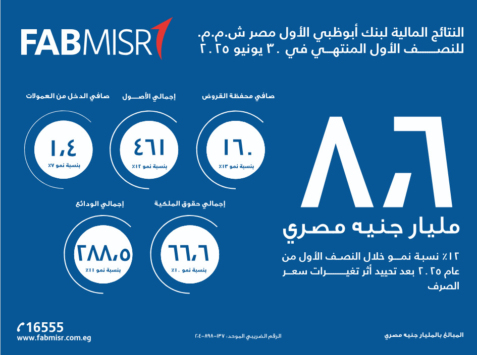 أعلن بنك أبوظبي الأول مصر، أحد أكبر البنوك العاملة في مصر، عن نتائجه المالية للنصف الأول من عام 2025، محققًا أداءً قويًا عبر جميع قطاعات الأعمال الرئيسية، حيث سجل البنك نموًا بنسبة 12% في صافي الأرباح بعد تحييد أثر تغيرات سعر الصرف، مقارنةً بنفس الفترة من العام الماضي، وهو ما يعكس كفاءة تشغيلية عالية وتنفيذًا استراتيجيًا ناجحًا، مع تحقيق قيمة مستدامة من العمليات الأساسية.