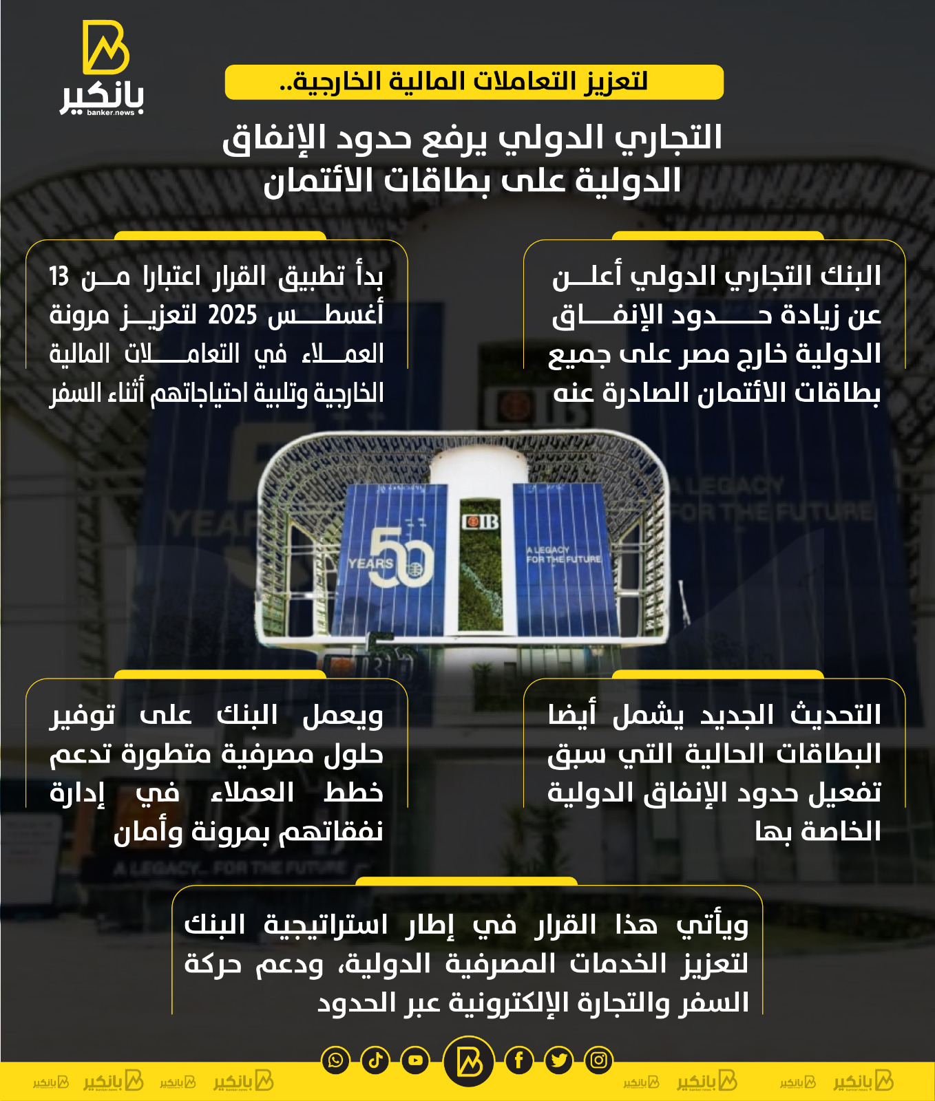 - البنك التجاري الدولي أعلن عن زيادة حدود الإنفاق الدولية خارج مصر على جميع بطاقات الائتمان الصادرة عنه