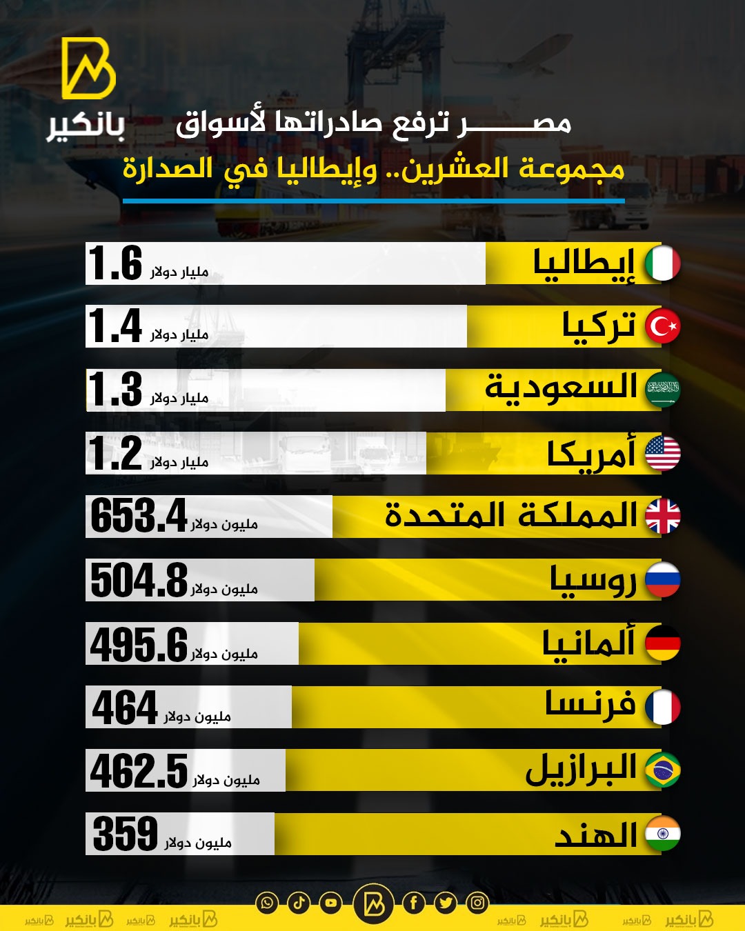 مصر ترفع صادراتها لأسواق مجموعة العشرين.. وإيطاليا في الصدارة | إنفوجراف