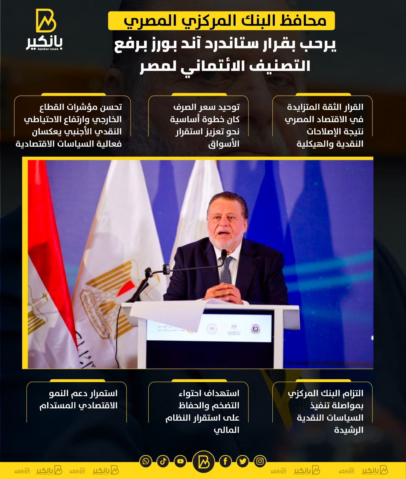 محافظ البنك المركزي المصري يرحب بقرار ستاندرد آند بورز برفع التصنيف الائتماني لمصر