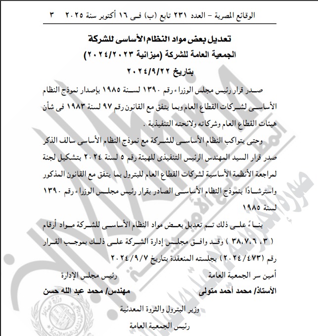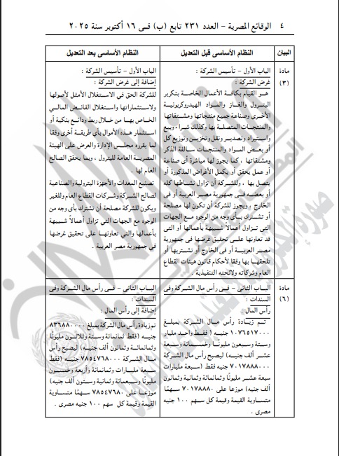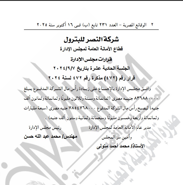 نشرت جريدة الوقائع المصرية في عددها رقم 231 تابع (ب) الصادر بتاريخ 16 أكتوبر 2025، قرار مجلس إدارة شركة النصر للبترول التابع لوزارة البترول والثروة المعدنية، بالموافقة على زيادة رأس مال الشركة المدفوع، وذلك ضمن خطة الدولة لتعزيز الملاءة المالية للشركات الوطنية العاملة في قطاع البترول ودعم قدرتها على التوسع في تنفيذ المشروعات الاستراتيجية.