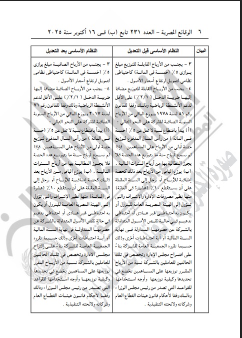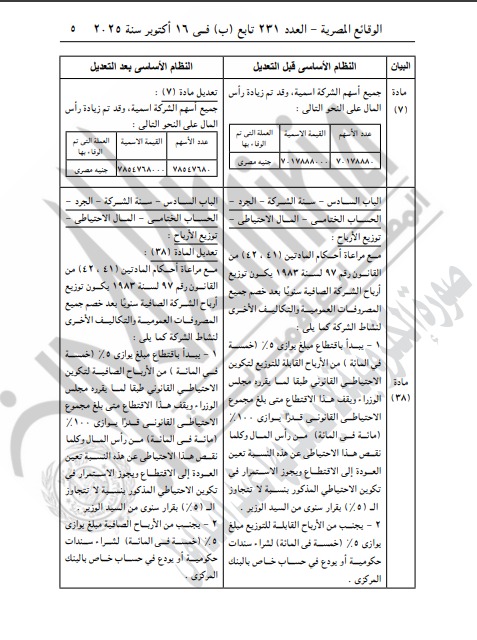 ووفقًا لما جاء في القرار رقم (472) الصادر عن الأمانة العامة لمجلس الإدارة في جلسته الحادية عشرة المنعقدة بتاريخ 7 سبتمبر 2025، فقد وافق المجلس بإجماع الأعضاء على زيادة رأس المال المدفوع بمقدار 836,880,000 جنيه مصري (ثمانمائة وستة وثلاثون مليونًا وثمانمائة وثمانون ألف جنيه)، ليصبح إجمالي رأس المال المدفوع الجديد للشركة 7,854,768,000 جنيه مصري (سبعة مليارات وثمانمائة وأربعة وخمسون مليونًا وسبعمائة وثمانية وستون ألف جنيه).