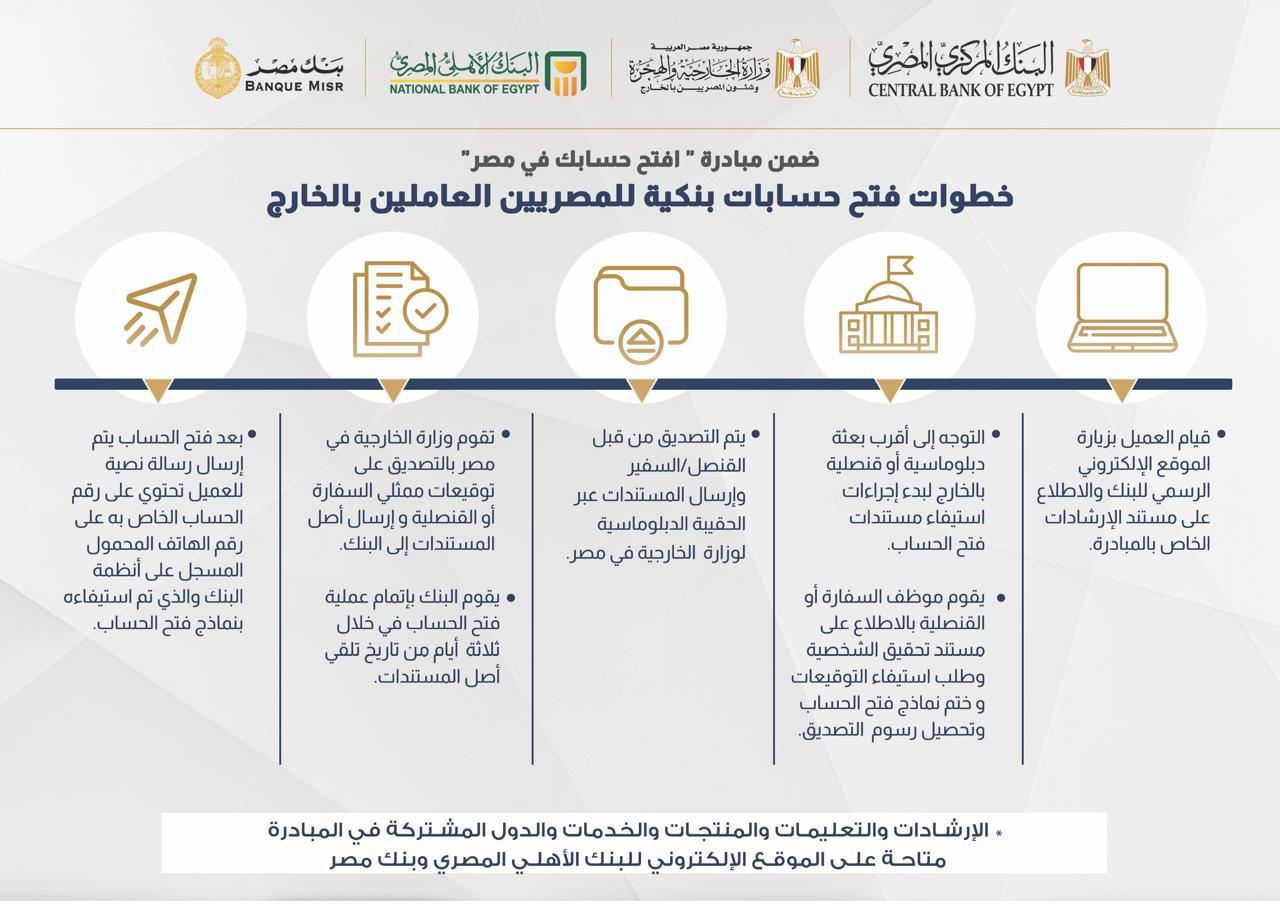 وتتيح المبادرة للمصريين العاملين بالخارج إمكانية فتح حسابات مصرفية في البنك الأهلي المصري أو بنك مصر، من خلال التوجه إلى أقرب مقر بعثة دبلوماسية أو قنصلية مصرية بالخارج، لاستيفاء النموذج الخاص بفتح الحساب والتوقيع عليه ثم التصديق عليه من جانب السفارة أو القنصلية التي ستتولى إرساله إلى ديوان وزارة الخارجية لمتابعة توثيق الأوراق ثم تسليمها إلى البنكين.