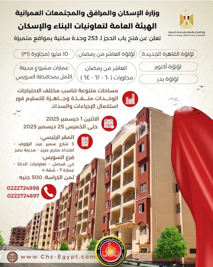 يأتي هذا الطرح الجديد ضمن خطة وزارة الإسكان لتوفير وحدات سكنية جاهزة للتسليم الفوري بمساحات متنوعة تلبي احتياجات المواطنين، مع استمرار جهود الهيئة العامة لتعاونيات البناء والإسكان في دعم مشروعاتها داخل المدن الجديدة والمحافظات المختلفة.