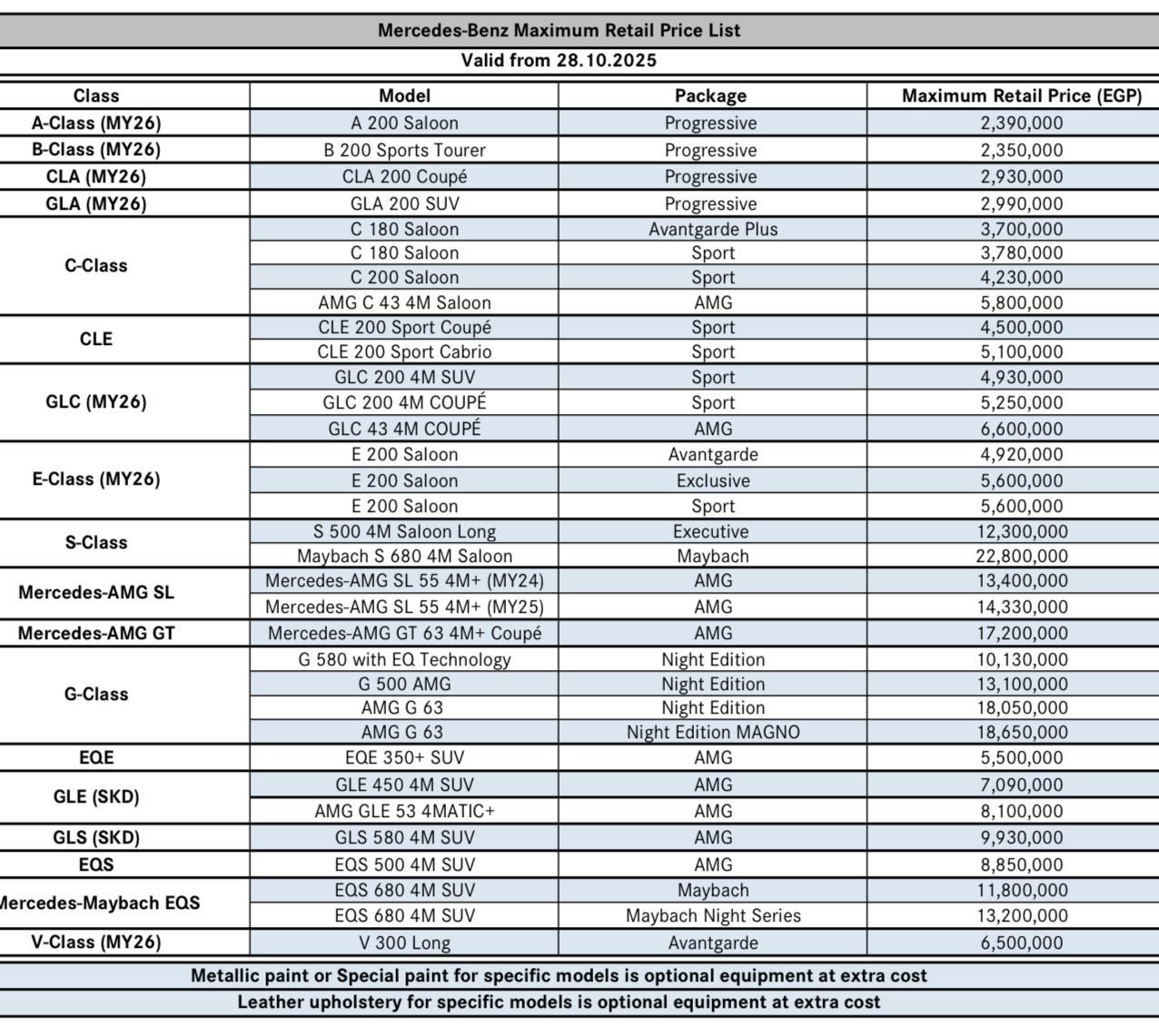 وضمت القائمة أكثر من 25 طرازًا من مختلف الفئات، بداية من A-Class وB-Class بأسعار تبدأ من 2.35 مليون جنيه، مرورًا بفئات C-Class وE-Class التي تتراوح بين 4.2 و5.6 مليون جنيه، وصولًا إلى الفئة الفاخرة S-Class التي بلغ سعرها 12.3 مليون جنيه لطراز S500 Long وارتفع إلى 22.8 مليون جنيه لطراز Maybach S 680 4M.