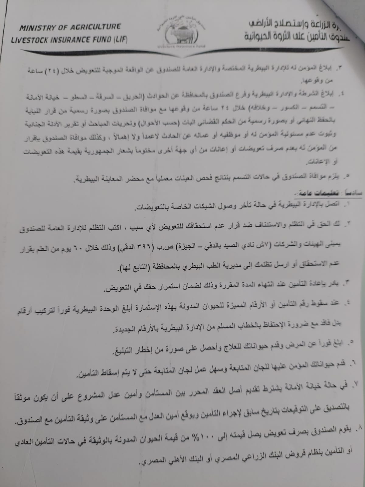 وتبلغ رسوم التأمين 1.5% فقط من القيمة الأساسية للحيوان سواء كان التأمين عادياً أو من خلال التأمين البنكي مع البنك الزراعي المصري أو البنك الأهلي.