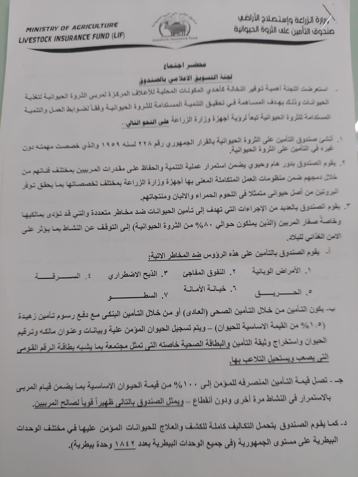 والصندوق الذي أنشئ بموجب القرار الجمهوري رقم 268 لسنة 1959 لا يزال حتى اليوم الجهة الوحيدة المخصصة للتأمين على الثروة الحيوانية بتكلفة زهيدة (1.5% فقط من قيمة الحيوان) مع تعويض يصل إلى 100% من القيمة الأساسية.