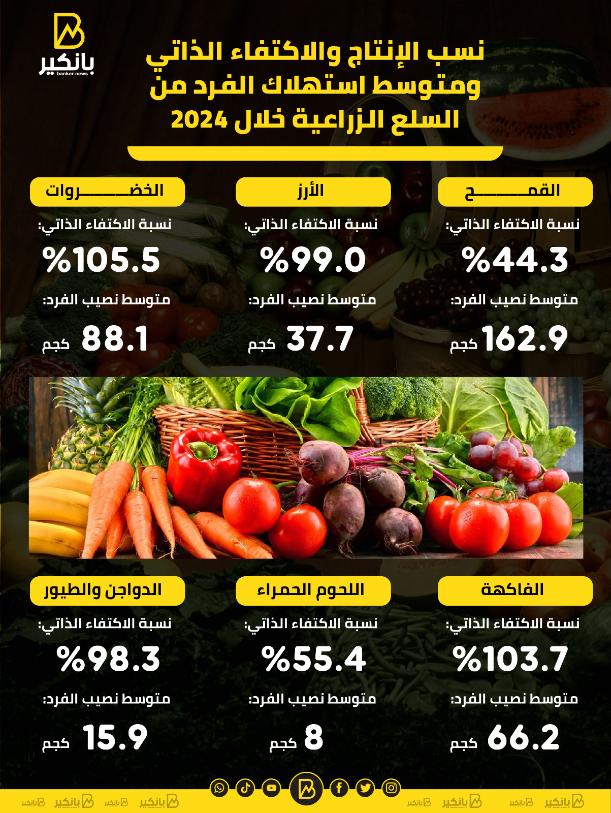 نسب الإنتاج والاكتفاء الذاتي ومتوسط استهلاك الفرد من السلع الزراعية خلال 2024