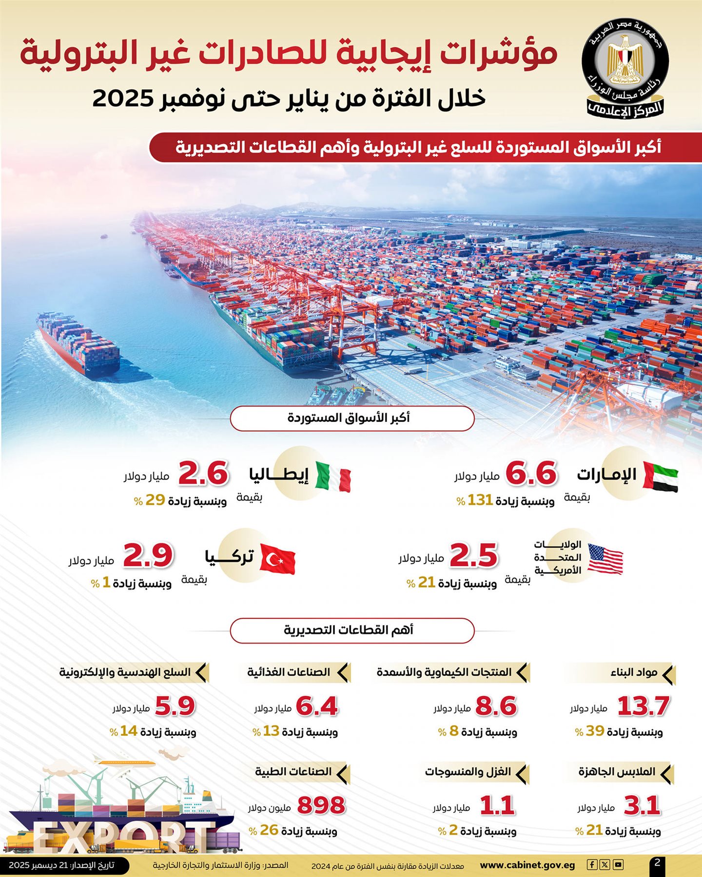 نشر المركز الإعلامي لمجلس الوزراء عددًا من الإنفوجرافات عبر منصاته الرسمية على مواقع التواصل الاجتماعي، استعرض من خلالها المؤشرات الإيجابية لأداء الصادرات غير البترولية المصرية خلال الفترة من يناير حتى نوفمبر 2025، في تأكيد جديد على نجاح السياسات الاقتصادية والتجارية التي انتهجتها الدولة لدعم قطاع التصدير وتعزيز تنافسية المنتج المصري في الأسواق العالمية.