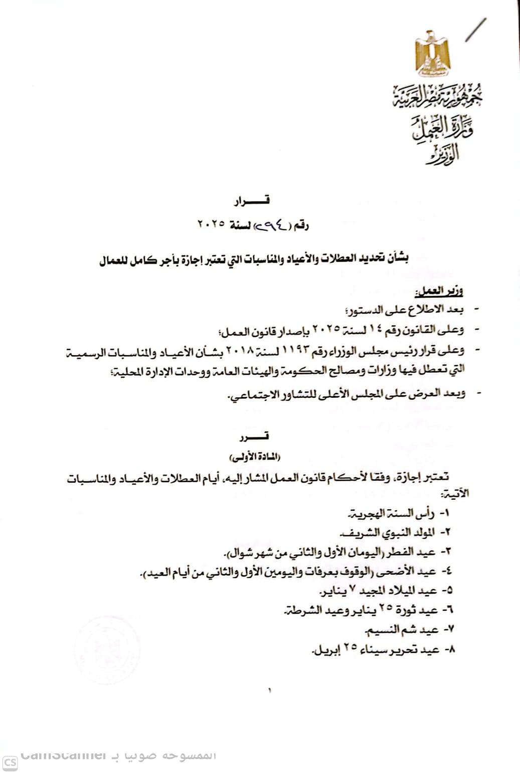 أصدر وزير العمل السيد/ محمد جبران القرار الوزاري رقم (294) لسنة 2025، بشأن تحديد العطلات والأعياد والمناسبات التي تُعد إجازة بأجر كامل للعمال، بعد الاطلاع على الدستور، وقانون العمل رقم (14) لسنة 2025، وقرار رئيس مجلس الوزراء رقم (1194) لسنة 2018، وبعد العرض على المجلس الأعلى للتشاور الاجتماعي.