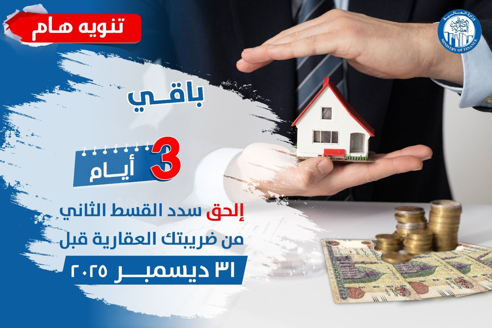 كشفت مصلحة الضرائب العقارية، عبر صفحاتها الرسمية على مواقع التواصل الاجتماعي، عن تبقي 3 أيام فقط على انتهاء المهلة القانونية لسداد القسط الثاني من الضريبة العقارية، والمحدد له يوم 31 ديسمبر 2025، مشددة على ضرورة التزام الممولين بالسداد في الموعد المحدد لتجنب تطبيق مقابل التأخير والغرامات القانونية المنصوص عليها في القانون.
