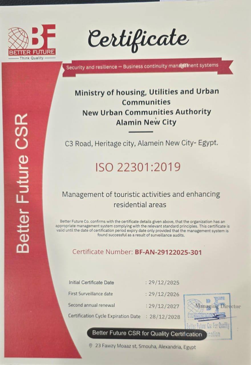 ومن جانبه، أوضح الدكتور مهندس محمد خلف الله، رئيس جهاز مدينة العلمين الجديدة والمشرف على جهاز القرى السياحية، أن الحصول على شهادة الأيزو يمثل خطوة فارقة في مسيرة الجهاز، ويجسد التزامه الكامل بتطبيق أفضل الممارسات العالمية في إدارة الأزمات والمخاطر، وتحسين جودة الخدمات، ورفع كفاءة الأداء المؤسسي، بما يحقق أعلى معدلات الانضباط والشفافية والاستدامة.