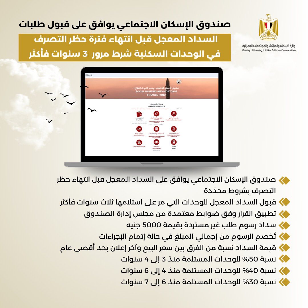 كما أكدت على أن جميع هذه الإجراءات يُشترط لتنفيذها قيام العميل بسداد كامل المستحقات الخاصة بالوحدة السكنية طرف جهة التمويل وتقديم إفادة مخالصة سداد كامل الثمن.