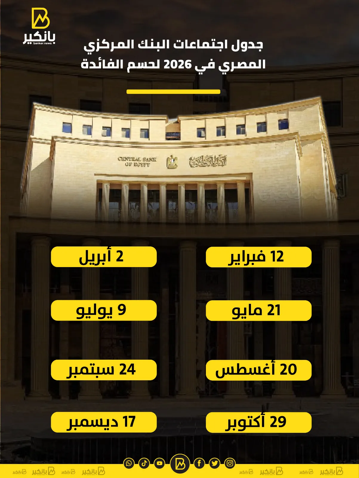 مواعيد اجتماع البنك المركزي المصري 2026.. 8 محطات لحسم الفائدة