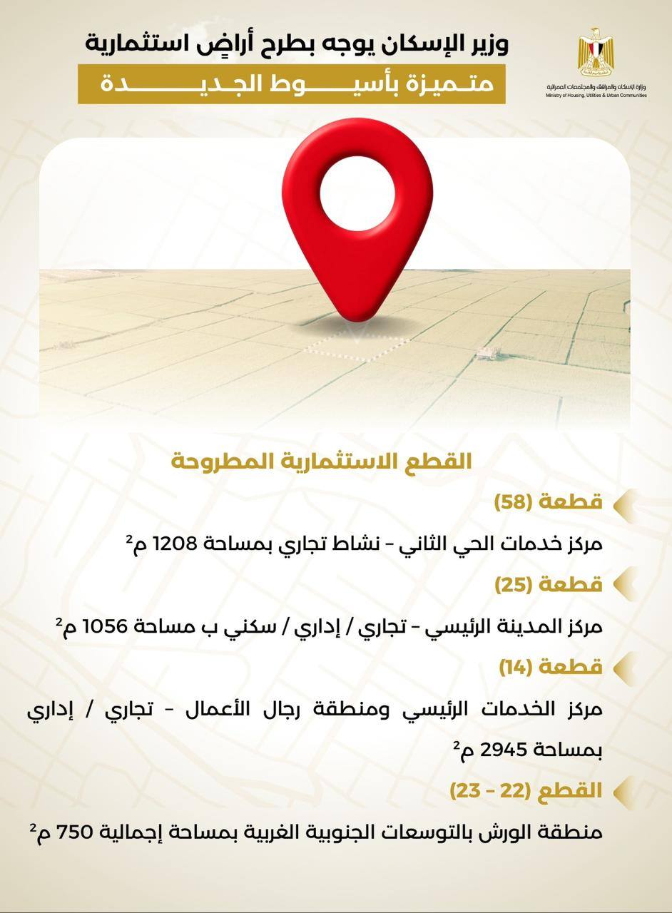 «الإسكان» تعلن عن طرح أراضٍ تجارية وإدارية وسكنية بأسيوط الجديدة