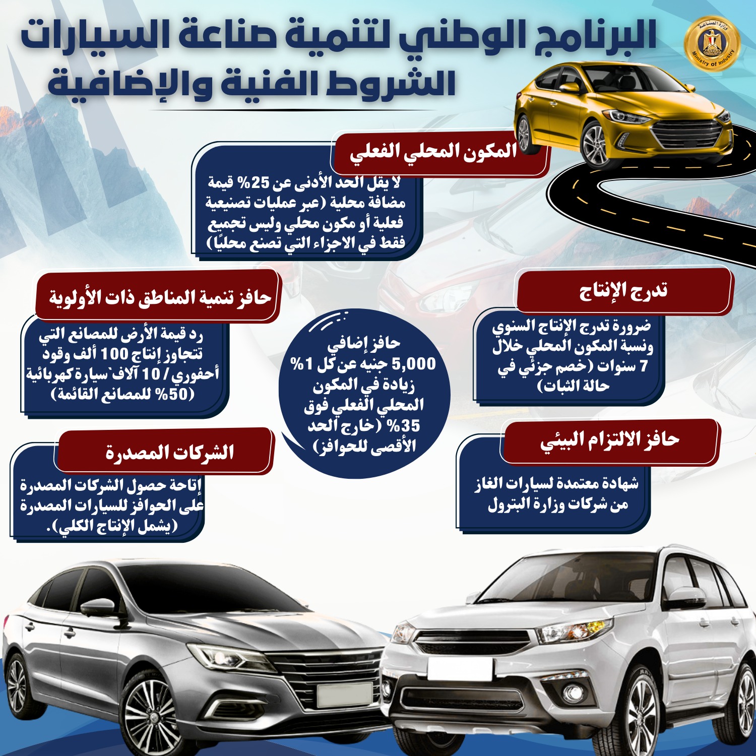 في إطار سعي الدولة لتوطين صناعة السيارات، وضعت وزارة الصناعة البرنامج الوطني لتنمية صناعة السيارات الذي ينطلق من رؤية الوزارة لبناء قاعدة صناعية قوية تنافسية وتهيئة مناخ استثماري عالمي جاذب للاستثمار في القطاع.