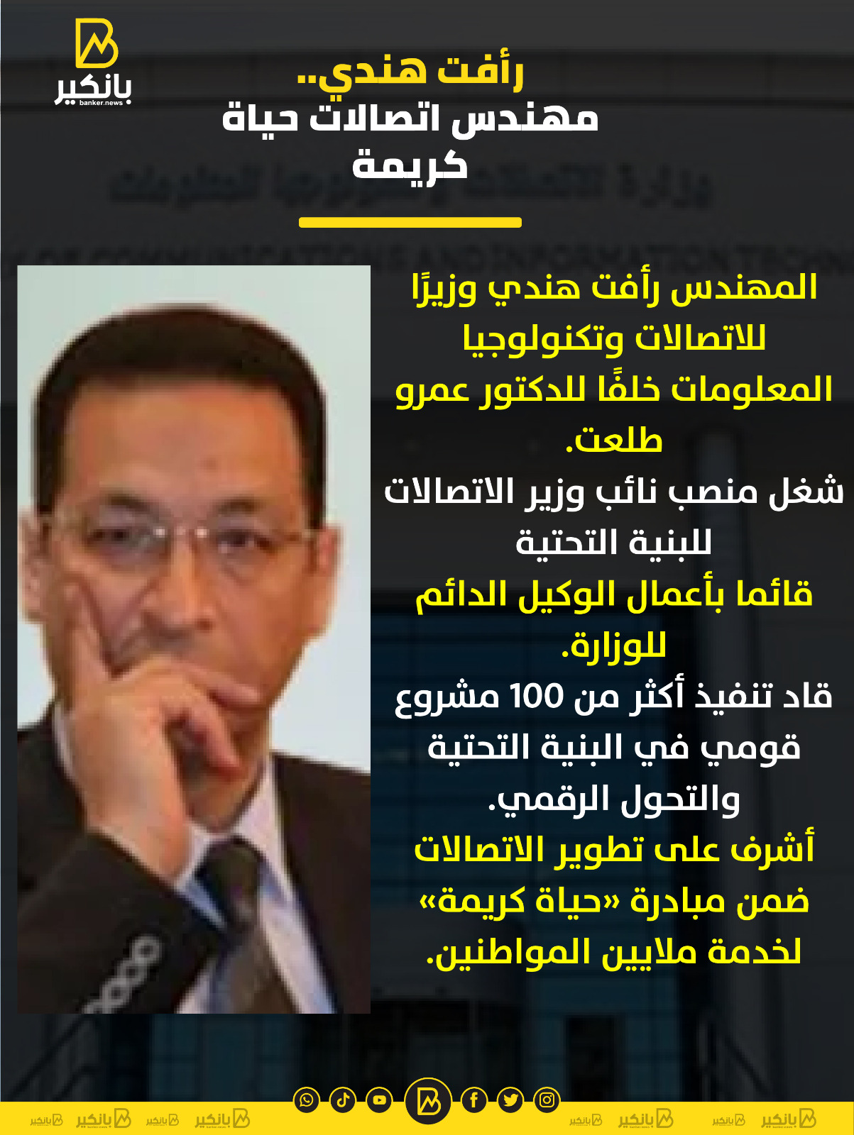 تعيين المهندس رأفت هندي وزيرًا للاتصالات وتكنولوجيا المعلومات خلفا للدكتور عمرو طلعت.