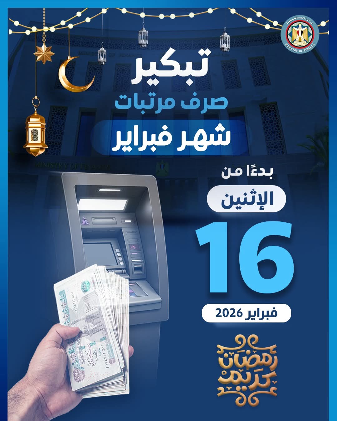 أكد أحمد كجوك وزير المالية أنه سيتم اعتبارًا من يوم الإثنين 16 فبراير بدء صرف مرتبات شهر فبراير للعاملين بالدولة بجميع الوزارات والهيئات والجهات التابعة لها، تزامنًا مع قرب حلول شهر رمضان المبارك.