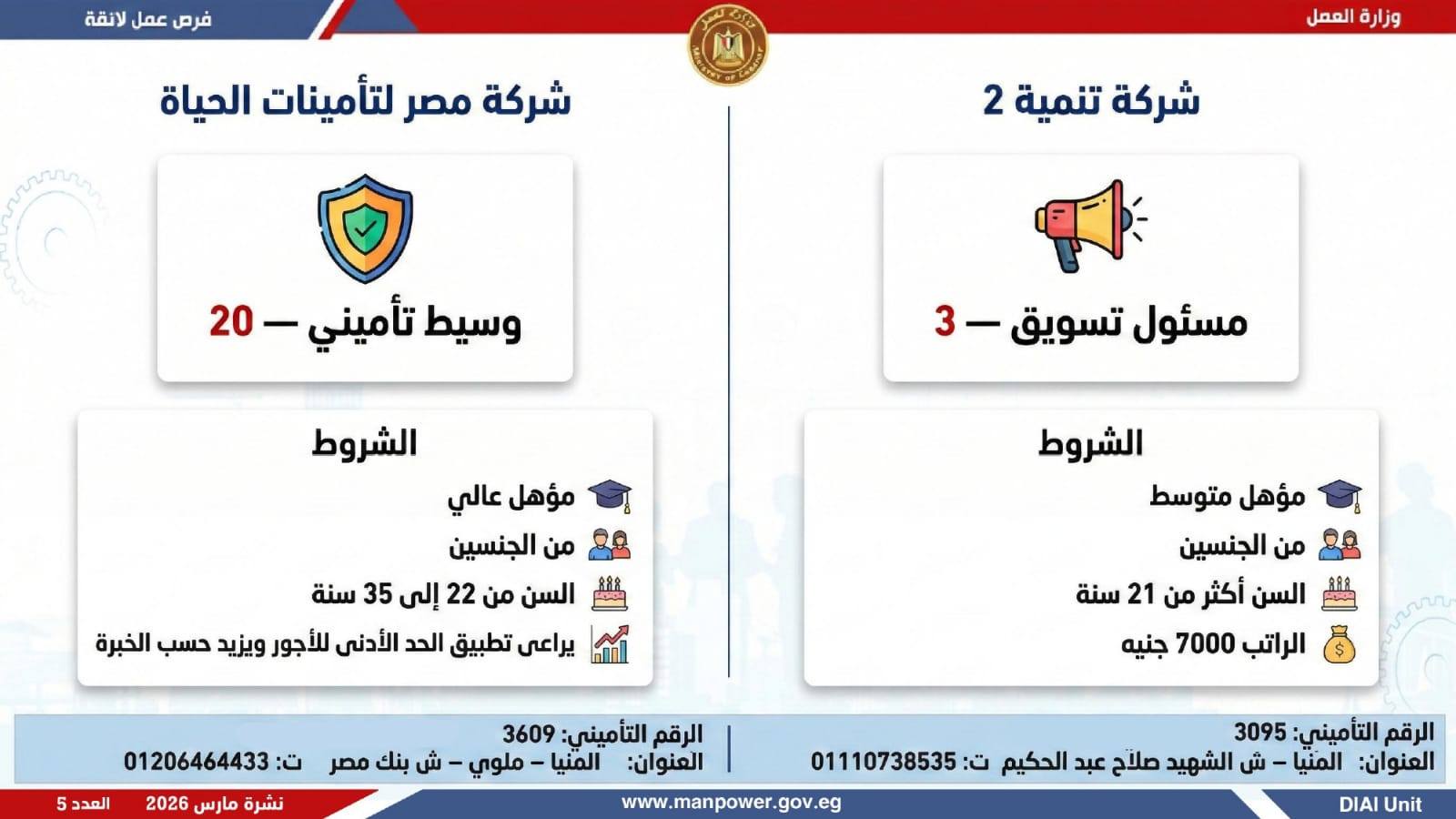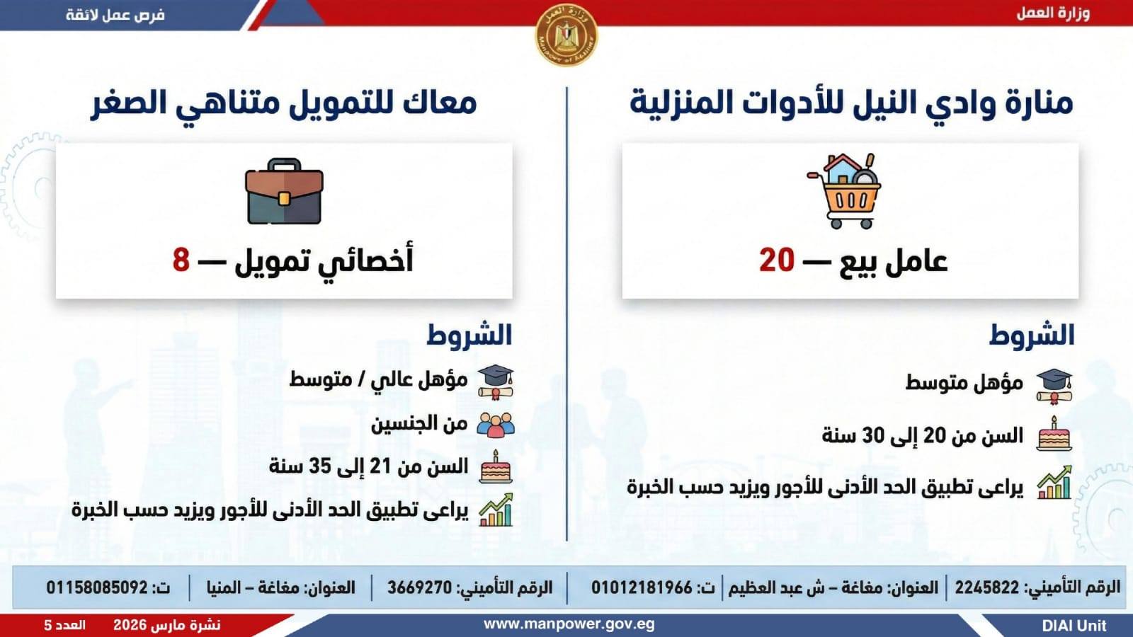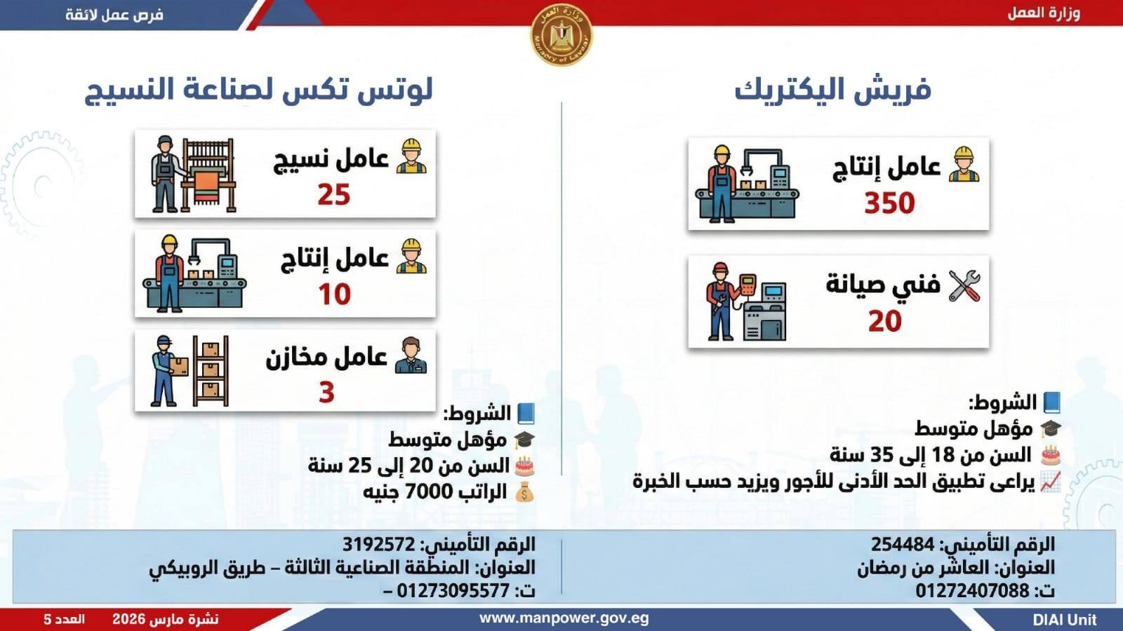 أعلنت وزارة العمل اليوم الإثنين، إطلاق نشرة التوظيف نصف الشهرية، التي تتضمن 5188 فرصة عمل حقيقية، بالتعاون مع 60 شركة من شركات القطاع الخاص، موزعة على 11 محافظة، مع فتح باب التقديم خلال شهر مارس 2026. ويأتي هذا الإجراء في إطار جهود الدولة لتوفير فرص عمل لائقة للشباب، وتحقيق الاستقرار الوظيفي، ودعم التنمية المستدامة بمشاركة القطاع الخاص كشريك أصيل.