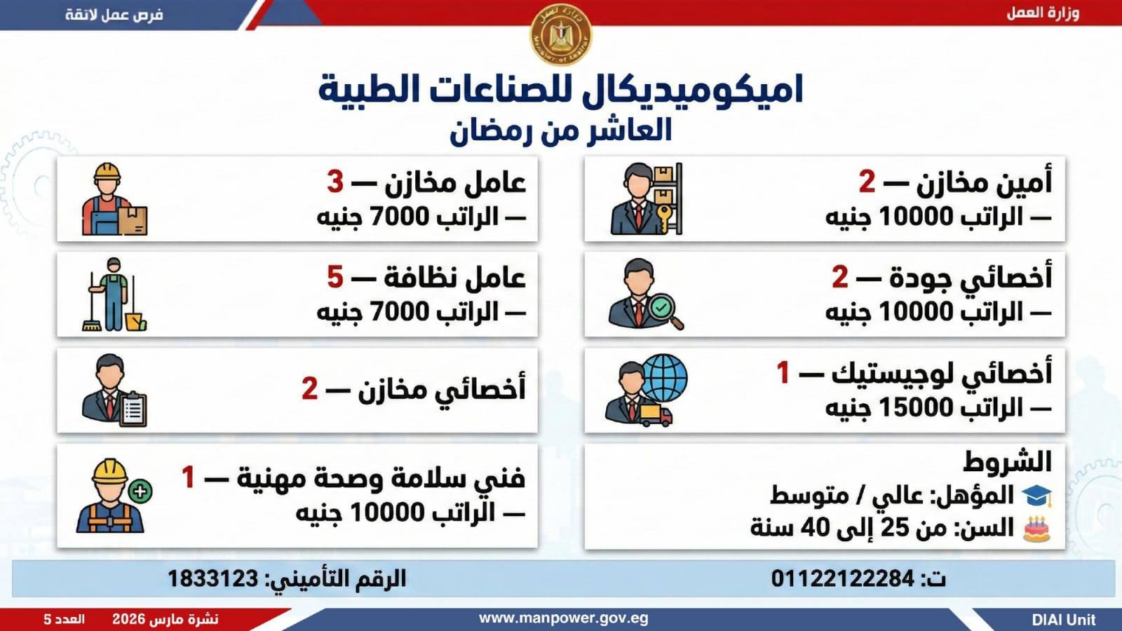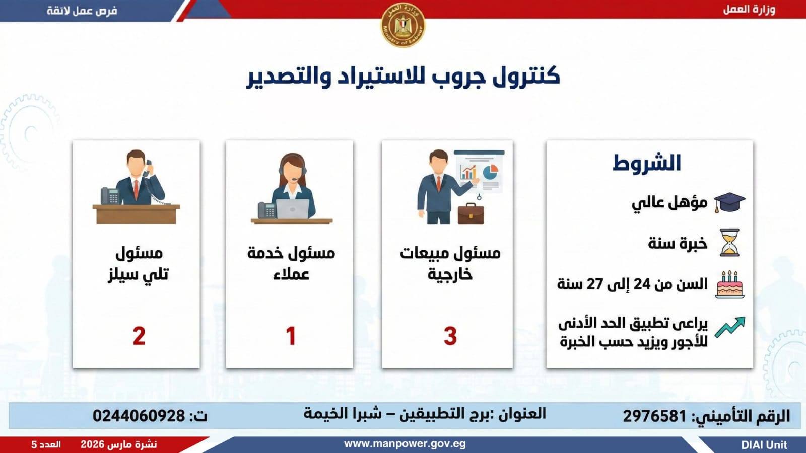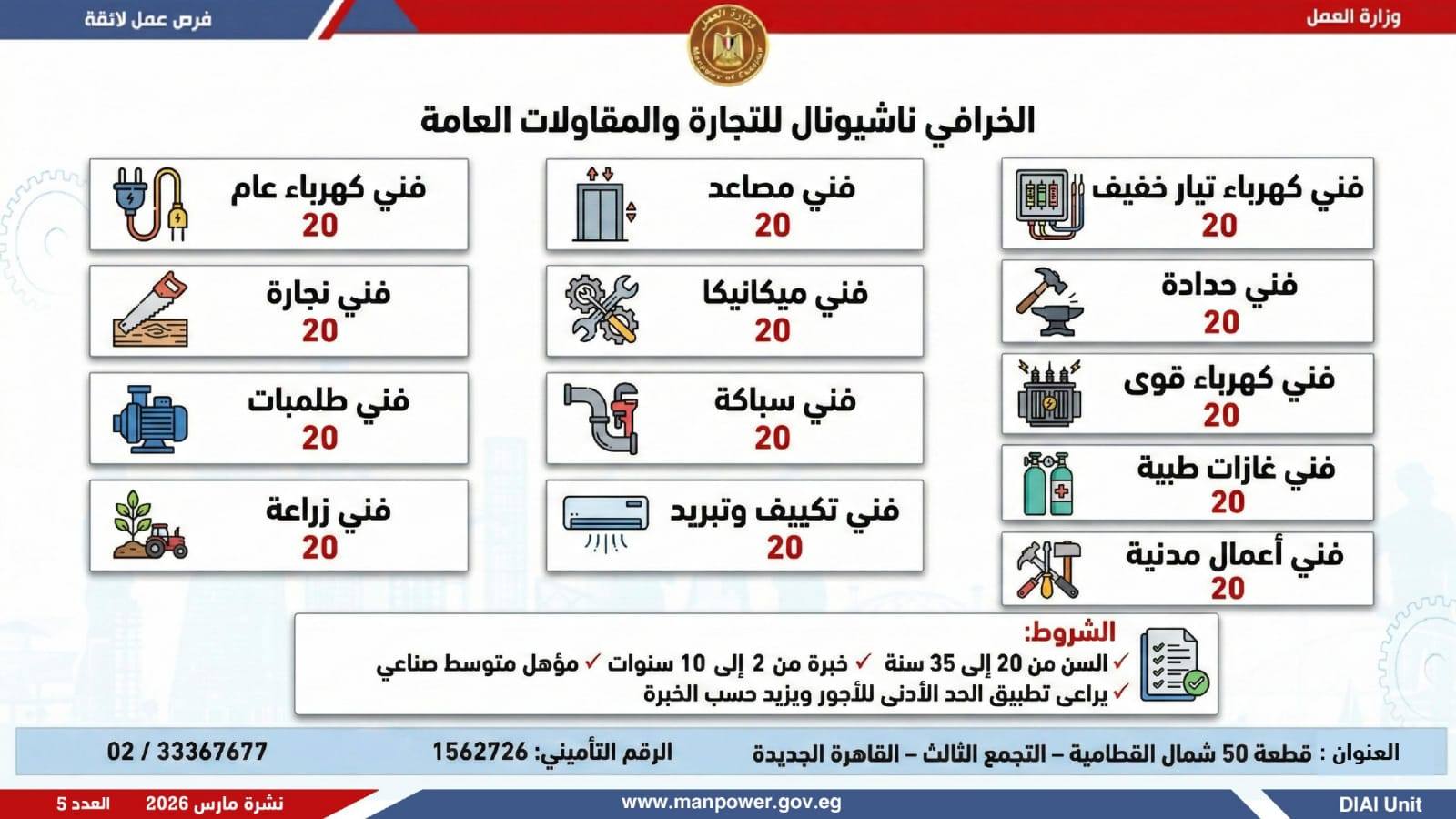 أعلنت وزارة العمل اليوم الإثنين، إطلاق نشرة التوظيف نصف الشهرية، التي تتضمن 5188 فرصة عمل حقيقية، بالتعاون مع 60 شركة من شركات القطاع الخاص، موزعة على 11 محافظة، مع فتح باب التقديم خلال شهر مارس 2026. ويأتي هذا الإجراء في إطار جهود الدولة لتوفير فرص عمل لائقة للشباب، وتحقيق الاستقرار الوظيفي، ودعم التنمية المستدامة بمشاركة القطاع الخاص كشريك أصيل.