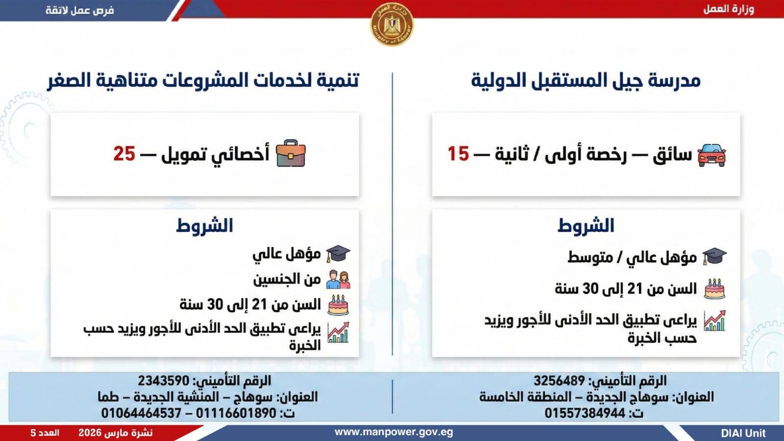 وتشمل الفرص الجديدة محافظات: القاهرة، الجيزة، القليوبية، الإسكندرية، المنيا، سوهاج، المنوفية، دمياط، أسوان، السويس، الشرقية. كما تحتوي النشرة على فرص خاصة بذوي الهمم، في إطار سياسة الدمج المجتمعي والتمكين الاقتصادي.