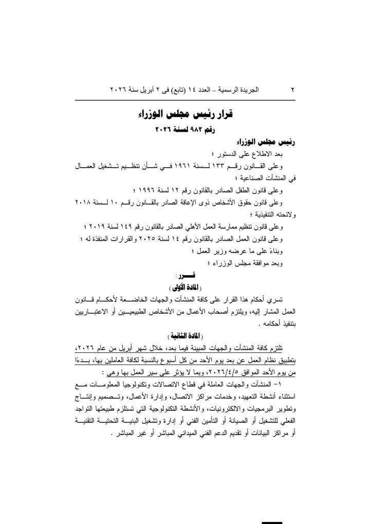 أصدرت وزارة العمل المصرية كتابًا دوريًا إلى مديرياتها بالمحافظات، لمتابعة تطبيق نظام العمل عن بُعد داخل منشآت القطاع الخاص، تنفيذًا لقرار مجلس الوزراء المصري رقم 982 لسنة 2026، والذي ينص على تنظيم العمل عن بُعد يوم الأحد من كل أسبوع خلال شهر أبريل الجاري، دون التأثير على انتظام سير العمل.
