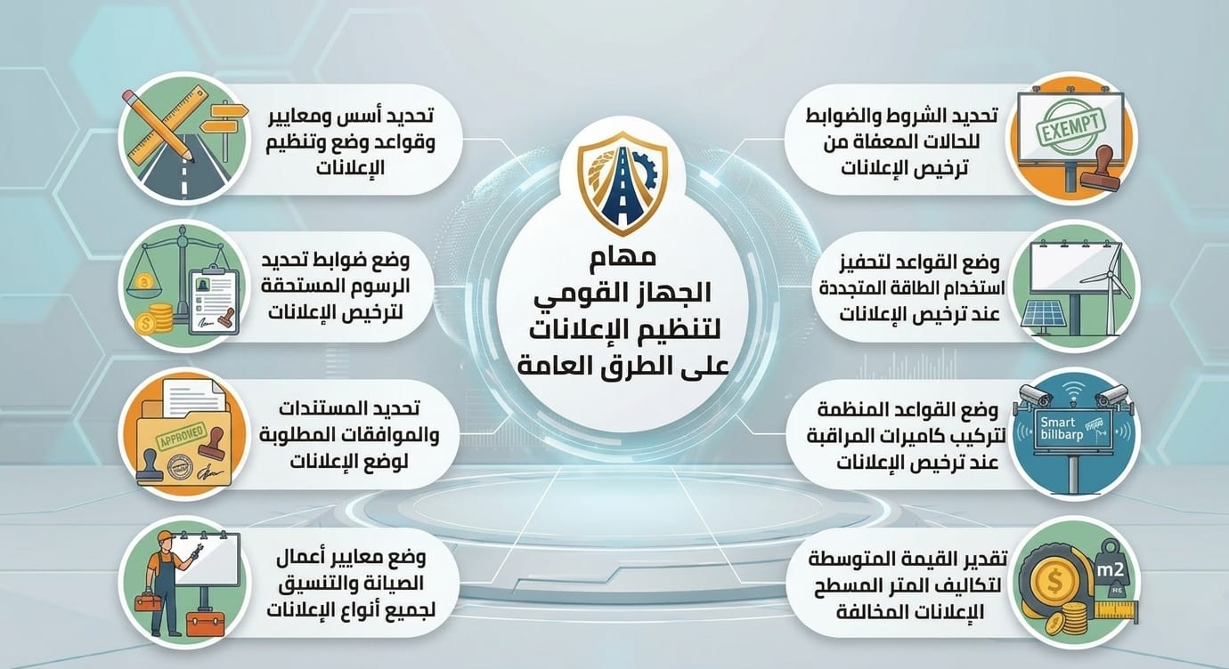 أوضح الجهاز القومي لتنظيم الإعلانات على الطرق العامة، التابع لرئاسة مجلس الوزراء، تفاصيل مهامه واختصاصاته التي تهدف إلى ضبط منظومة الإعلانات واللافتات في الشوارع والطرق، بما يحقق الانضباط ويحافظ على الشكل الحضاري.
