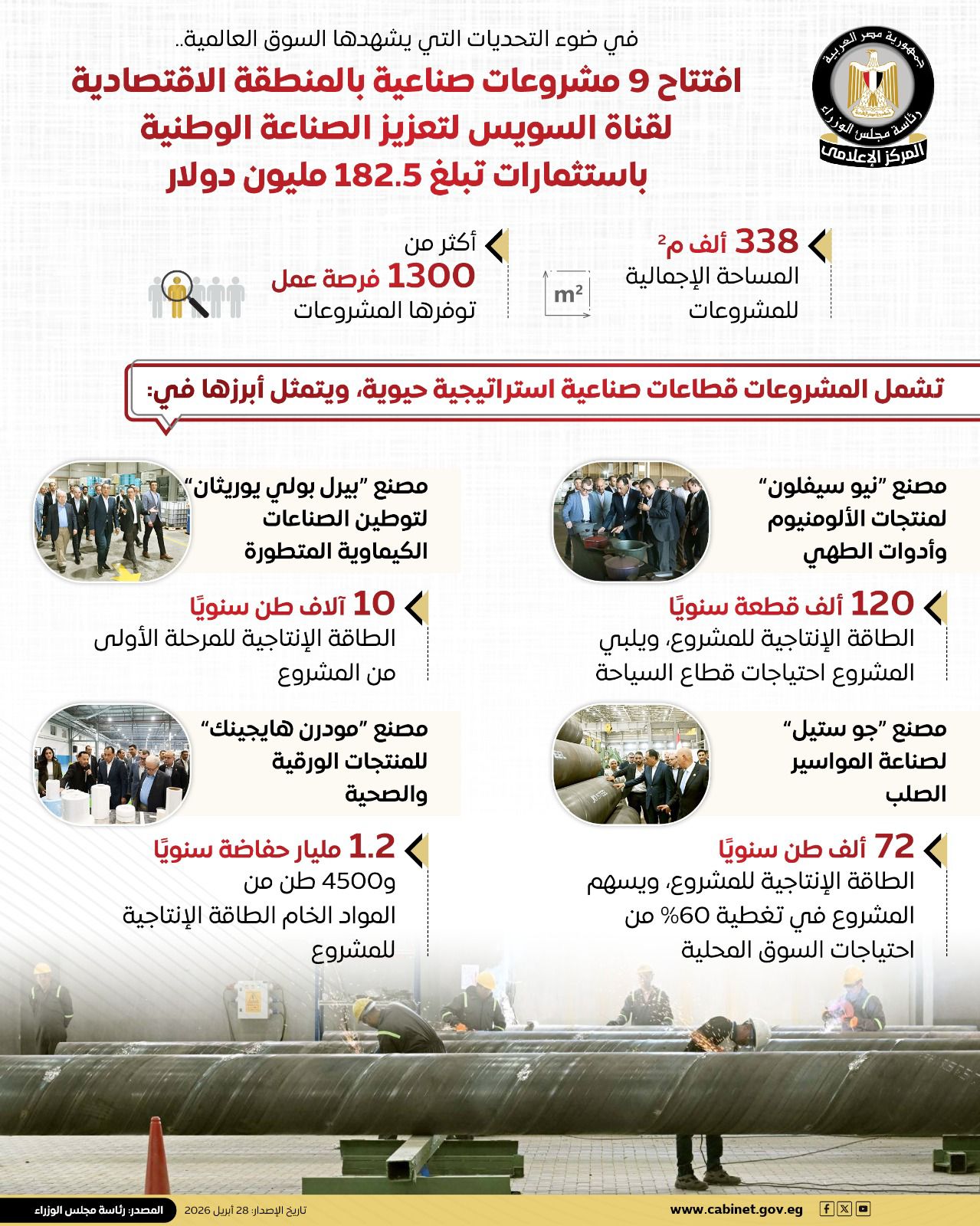 أعلن المركز الإعلامي لـ مجلس الوزراء عن تدشين وافتتاح 9 مشروعات صناعية كبرى بالمنطقة الاقتصادية لقناة السويس، وذلك في إطار تنفيذ التوجيهات الرئاسية بدعم الصناعة الوطنية ومواجهة التحديات التي يفرضها السوق العالمي.