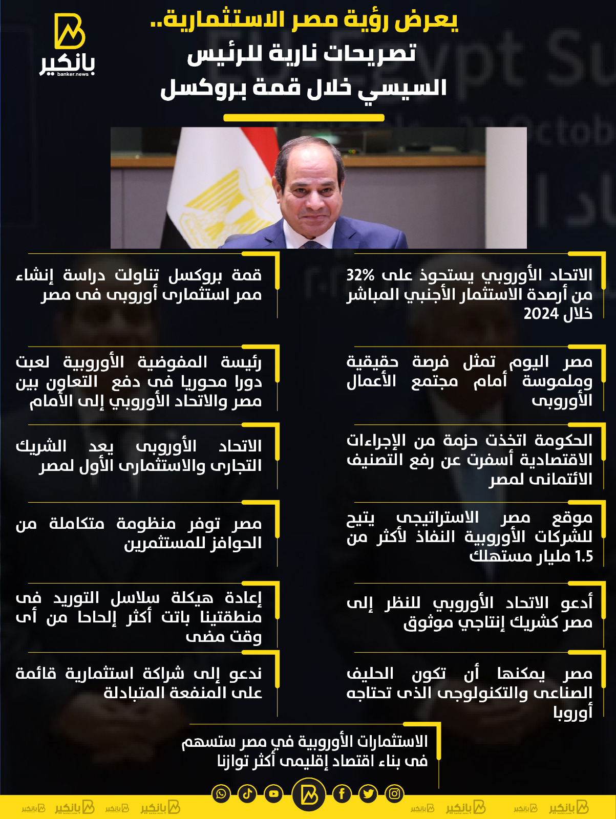 يعرض رؤية مصر الاستثمارية.. تصريحات نارية للرئيس السيسي خلال قمة بروكسل |إنفوجراف
