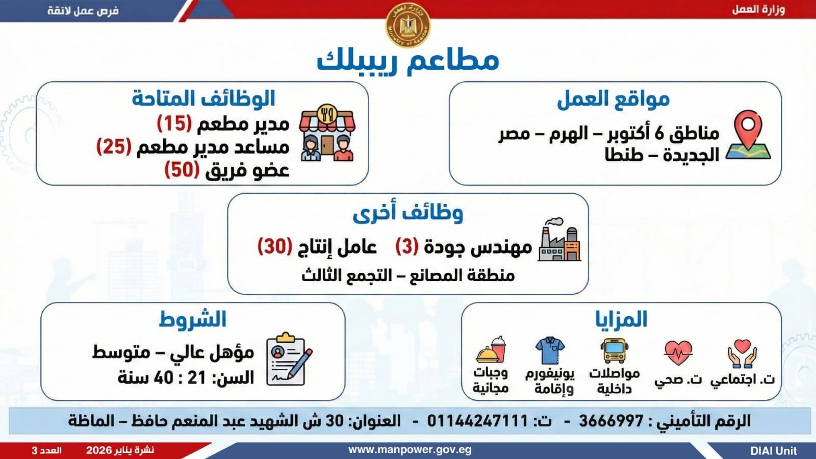 وأوضح الوزير أن الوظائف المتاحة تشمل مجموعة واسعة من التخصصات والمهن، وتغطي محافظات: القاهرة، القليوبية، الإسكندرية، الغربية، الإسماعيلية، المنيا، سوهاج، بني سويف، المنوفية، قنا، دمياط، والفيوم.