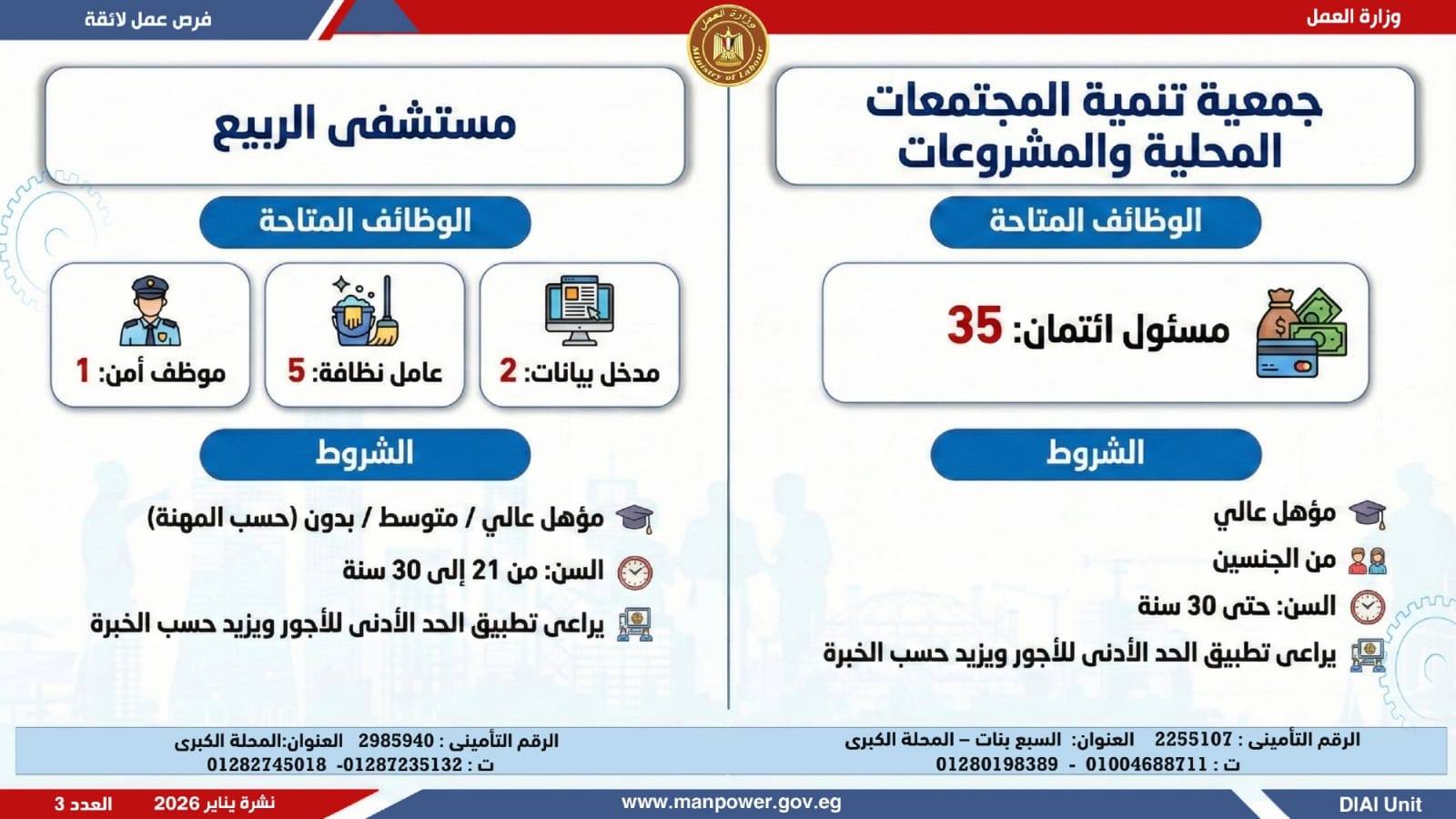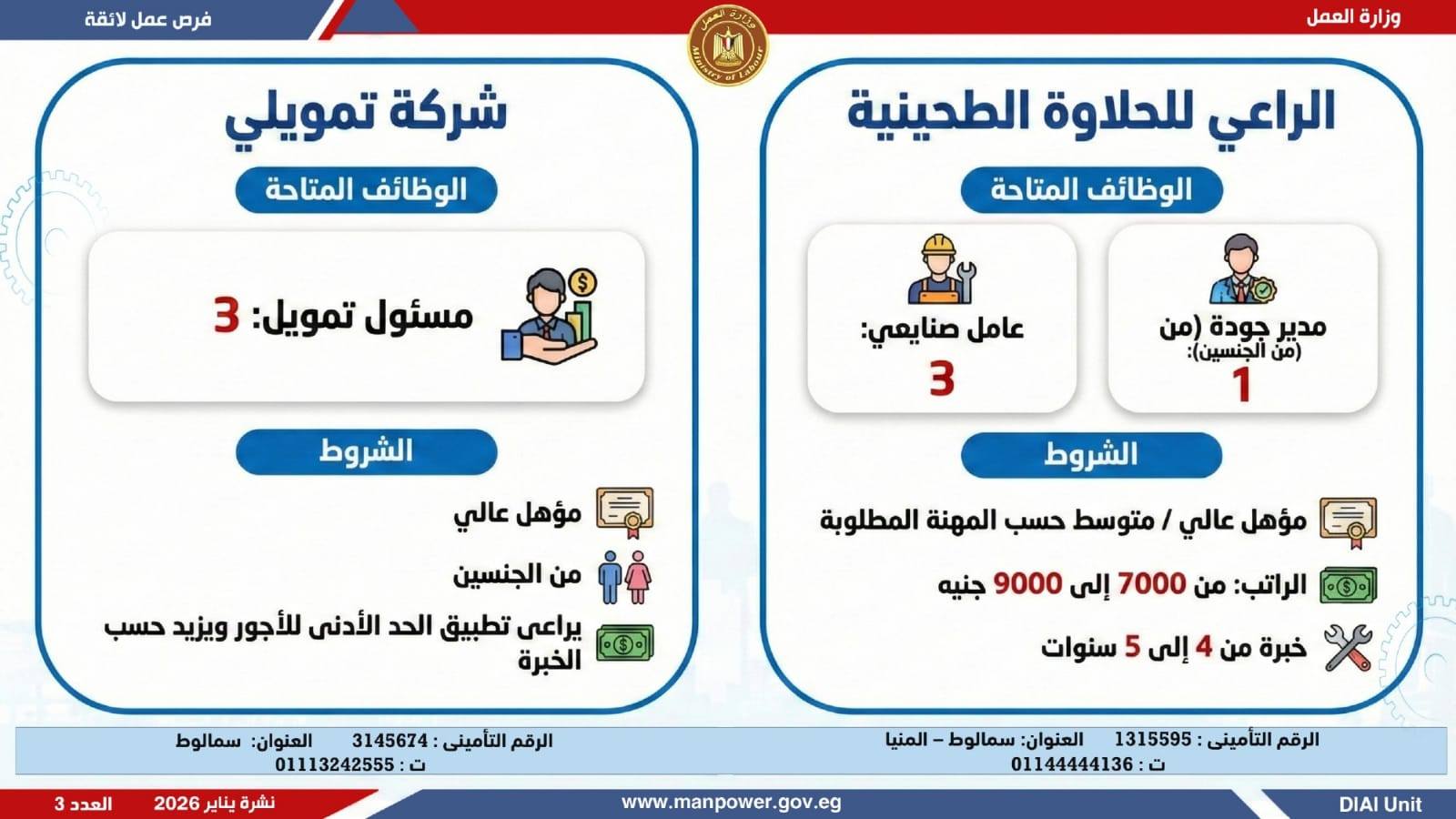 في إطار جهود الدولة المصرية لمواجهة البطالة وتعزيز فرص التشغيل للشباب، أعلنت وزارة العمل اليوم الثلاثاء عن إصدار نشرة التوظيف نصف الشهرية، والتي تتضمن توفير 4379 فرصة عمل جديدة بالتعاون مع 37 شركة خاصة موزعة على 12 محافظة، وذلك خلال شهر فبراير 2026.