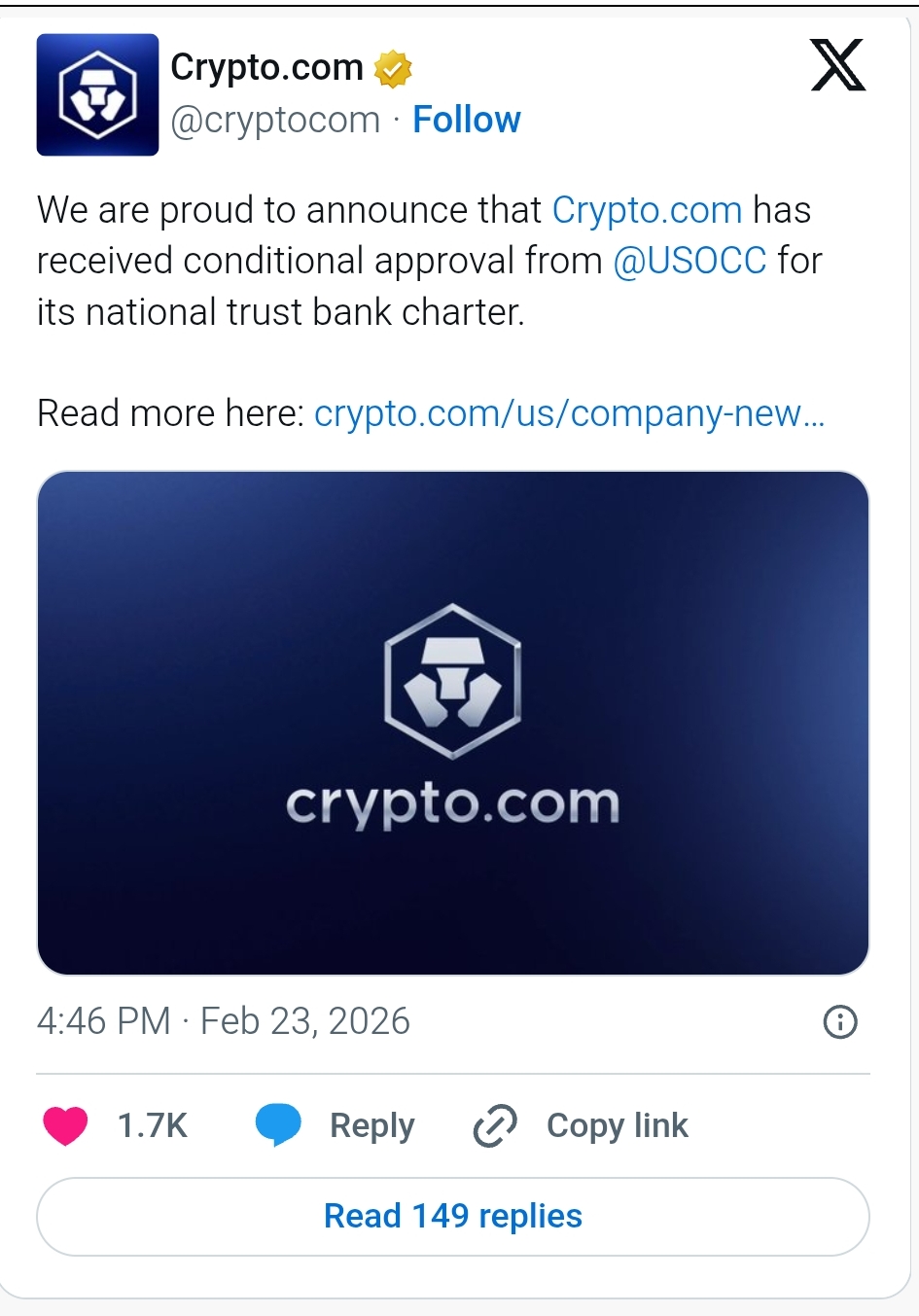 تتيح الموافقة المشروطة للشركة تقديم خدمات مثل حفظ الأصول الرقمية وتسوية الصفقات المالية، مع العمل تحت اسم كريبتو دوت كوم ناشيونال ترست بنك.