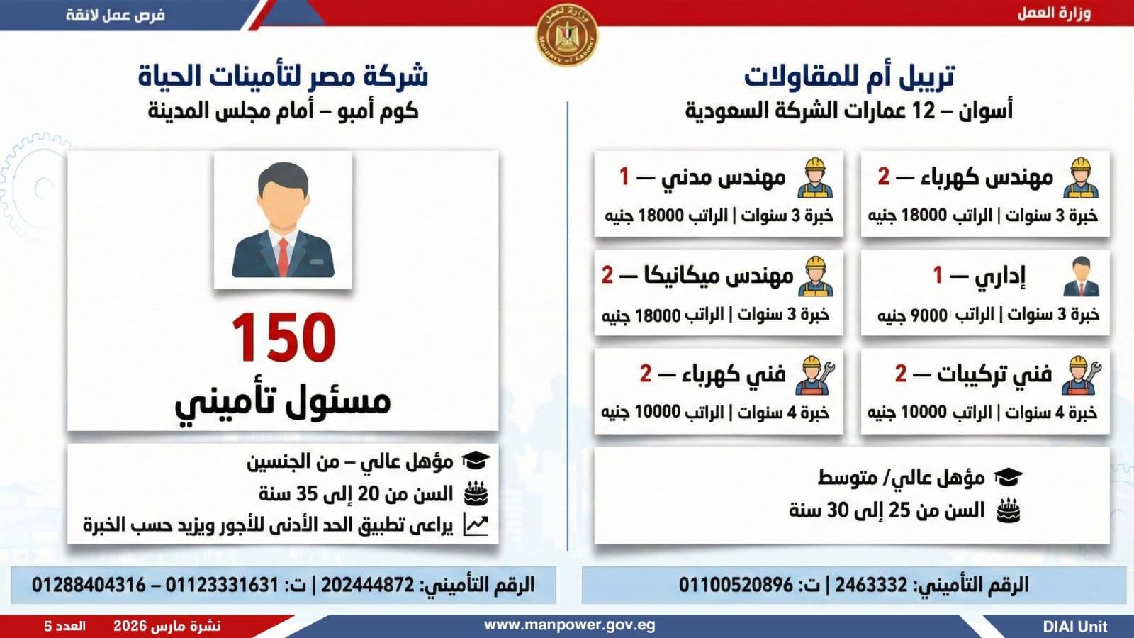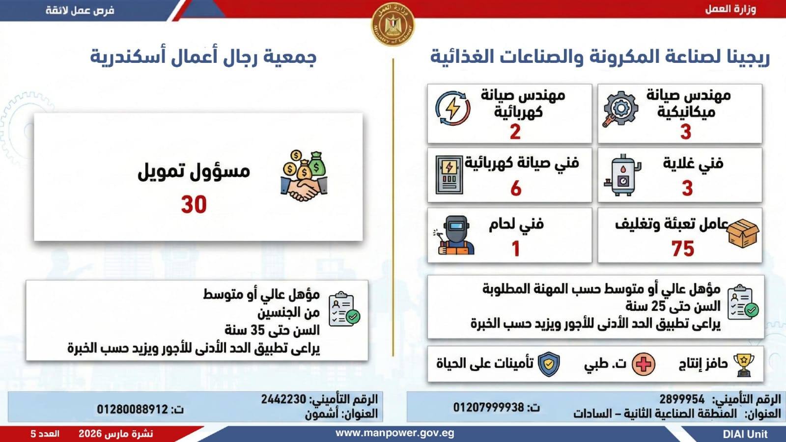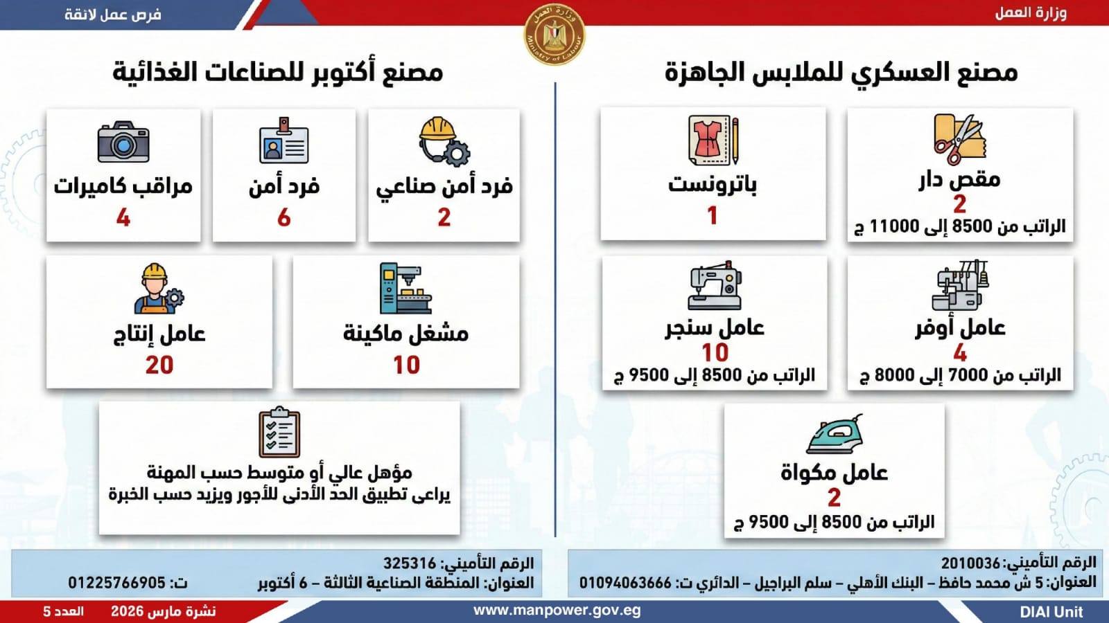 أعلنت وزارة العمل اليوم الإثنين، إطلاق نشرة التوظيف نصف الشهرية، التي تتضمن 5188 فرصة عمل حقيقية، بالتعاون مع 60 شركة من شركات القطاع الخاص، موزعة على 11 محافظة، مع فتح باب التقديم خلال شهر مارس 2026. ويأتي هذا الإجراء في إطار جهود الدولة لتوفير فرص عمل لائقة للشباب، وتحقيق الاستقرار الوظيفي، ودعم التنمية المستدامة بمشاركة القطاع الخاص كشريك أصيل.