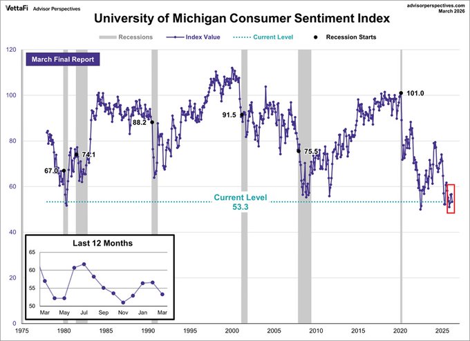 وتشير البيانات إلى أن هذا المستوى أصبح أدنى من القاع المسجل خلال الأزمة المالية العالمية عام 2008، ويقترب من القاع التاريخي لركود الثمانينيات، ما يعكس حالة من القلق الحاد بين الأسر الأمريكية بشأن الوضع الاقتصادي الراهن والمستقبلي.