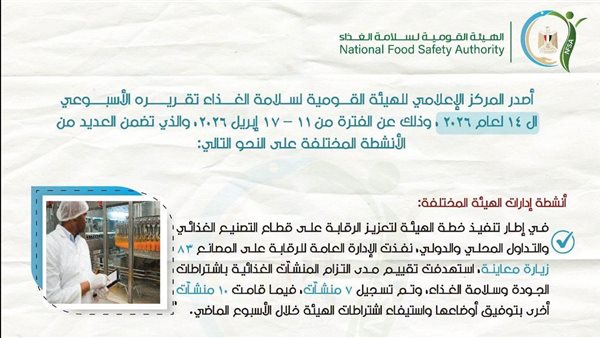 أصدر المركز الإعلامي للهيئة القومية لسلامة الغذاء تقريره الـ 14 لعام 2026، موثقاً نشاطاً رقابياً وتصديرياً مكثفاً خلال الفترة من 11 إلى 17 أبريل.