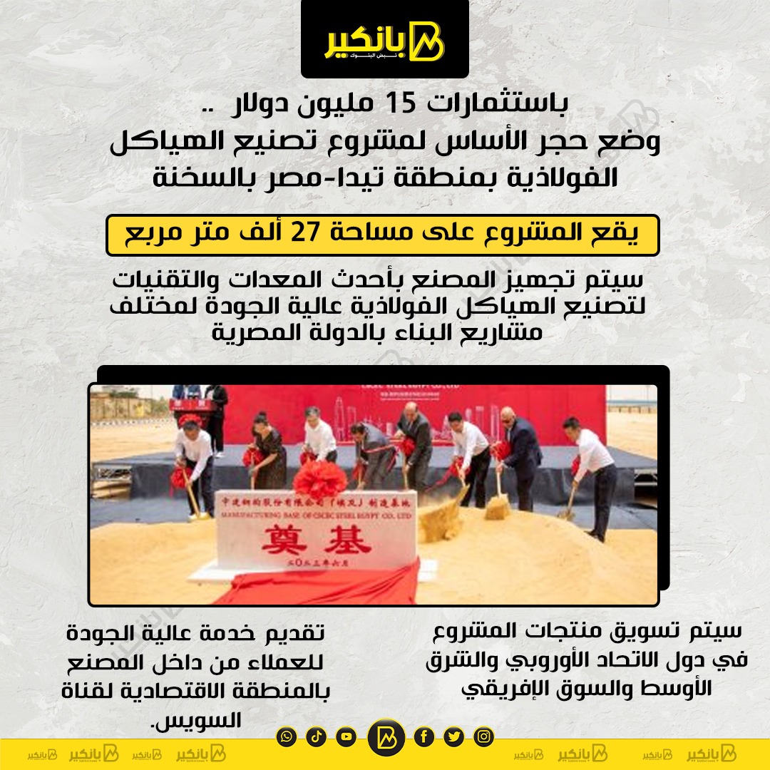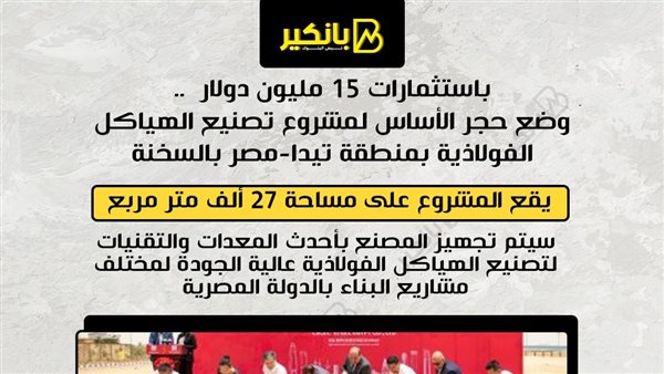 يقع المشروع على مساحة 27 ألف متر مربع سيتم تجهيز المصنع بأحدث المعدات والتقنيات لتصنيع الهياكل الفولاذية عالية الجودة لمختلف مشاريع البناء بالدولة المصرية. سيتم تسويق منتجات المشروع في دول الاتحاد الأوروبي والشرق الأوسط والسوق الإفريقي ، تقديم خدمة عالية الجودة للعملاء من داخل المصنع بالمنطقة الاقتصادية لقناة السويس.
