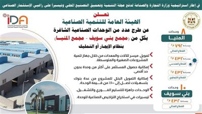 "التنمية الصناعية" تطرح 18 وحدة صناعية جاهزة بمجمعات بني سويف والمنيا
